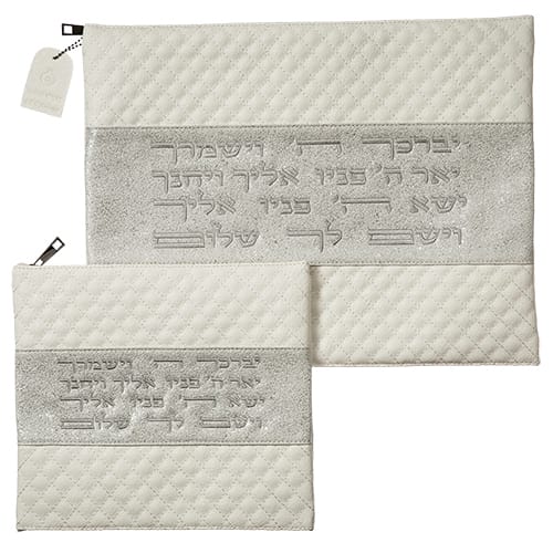תיק טלית ותפילין – כיסוי לטלית ותפילין לבן כסוף ברכת כוהנים באלכסון דמוי עור