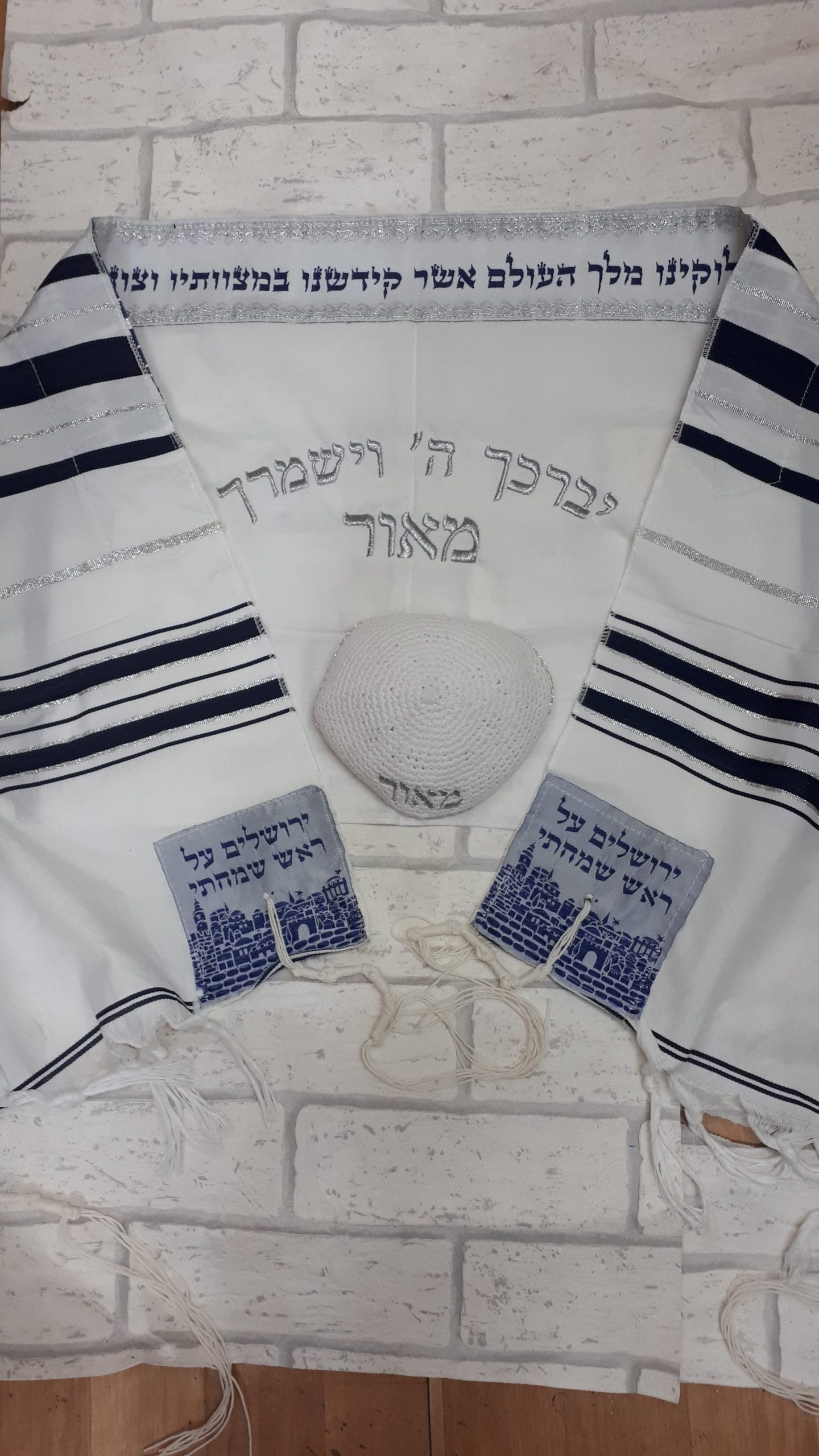 סט חלאקה כולל טלית ברכת כוהנים כיפה ריקמת שם