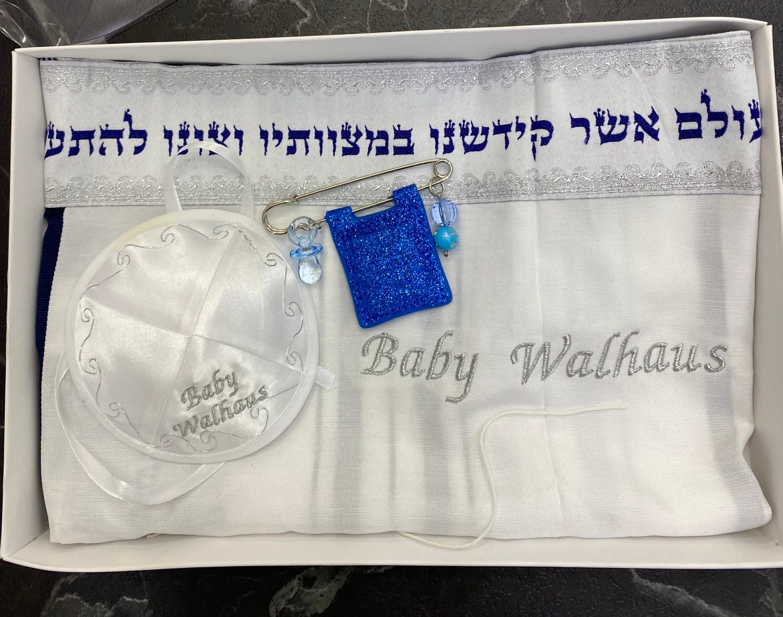 סט לתינוק טלית עם ריקמת שם כיפה עם שם ומחזיק תהילים לעגלה